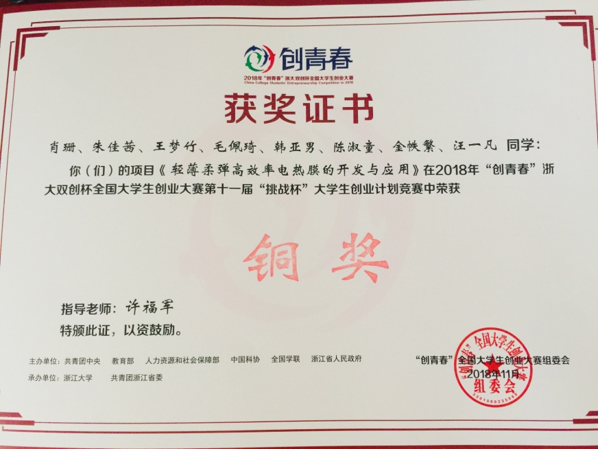 11月3日,2018年“创青春”全国大学生创业大赛在浙江大学落下帷幕,本届大赛是党的十九大之后举办的第一届“创青春”大赛,大赛以“弄潮创青春、建功新时代”为主题,于今年3月全面启动,全国共收到2200余所高校的逾百万名大学生、15万余件作品报名参赛。经过各高校校赛、各省级竞赛、全国复赛选拔,共有来自全国31个省(自治区、直辖市),以及新疆生产建设兵团、香港特别行政区、澳门特别行政区197所高校的369件作品入围终审决赛。晋江文学城 许福军老师指导的《轻薄柔弹高效率电热膜的开发与应用》项目在创业计划赛中突出重围,力夺铜奖。