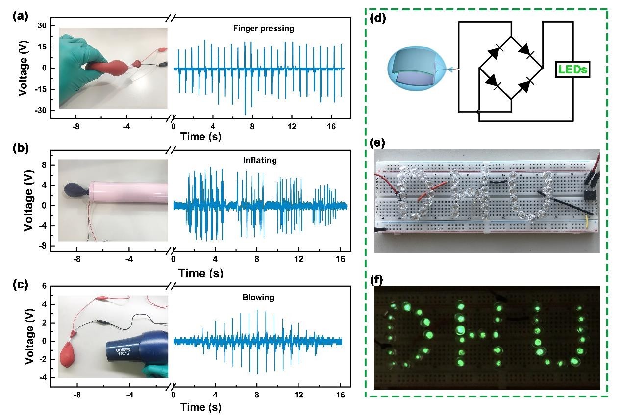针对这种新型结构的能源器件,研究人员系统地研究了其在不同内部气压下的电输出性能,证明了在内压为0.5kpa时,该器件能产生最大输出。同时,还发现器件内部的空气能平衡外力的分布,使输出性能的正反向信号均匀化。此外,还比较和分析了不同作用力、频率、空气相对湿度、温度等外界因素对器件电输出性能的影响,进一步验证了其环境适应性。