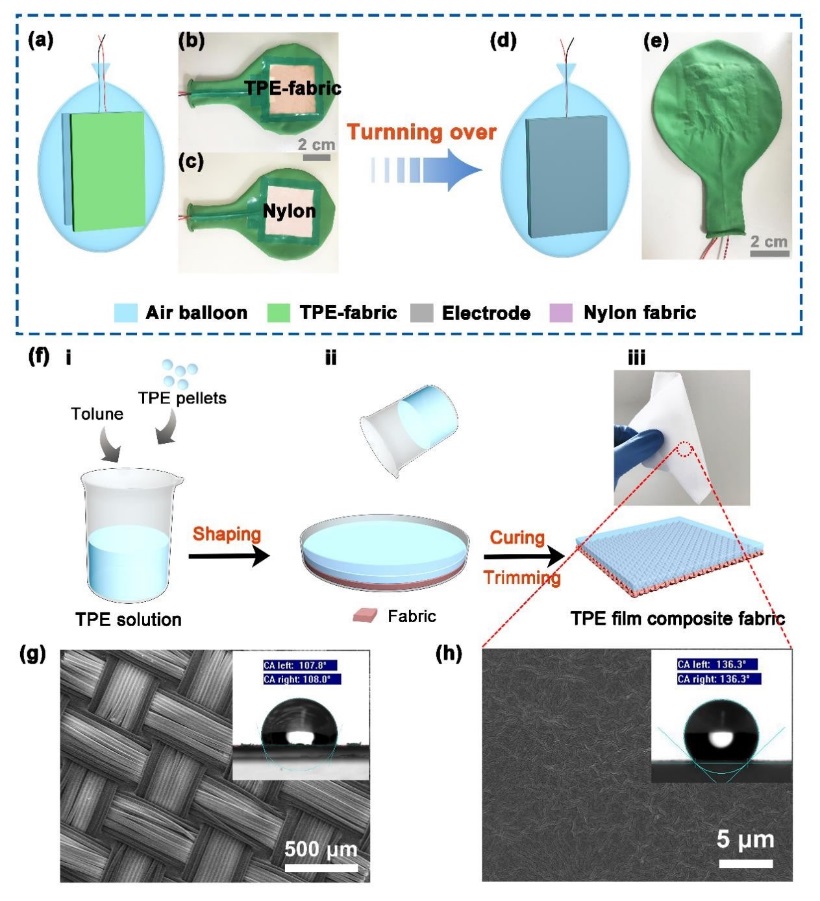 针对上述问题,研究团队选用弹性高、气密性好、机械强度高的乳胶气囊作为摩擦电纳米机的密封基材;同时采用纺织丝网印刷技术制备出银涂层的锦纶织物作为正摩擦材料、采用纺织涂层技术制备热塑性弹性体TPE/锦纶/银复合织物作为负摩擦材料,并巧妙装配制备出一种由空气作为间隔支撑部件的密封结构一体式摩擦纳米发电器件。其利用空气的的可压缩特性,有效实现了摩擦纳米发电机周期性的柔和接触与分离,可对环境中多种形式机械能的进行收集和利用。此外,这种空气间隔-密封结构的摩擦纳米发电机大大提高了提高其环境适应性。