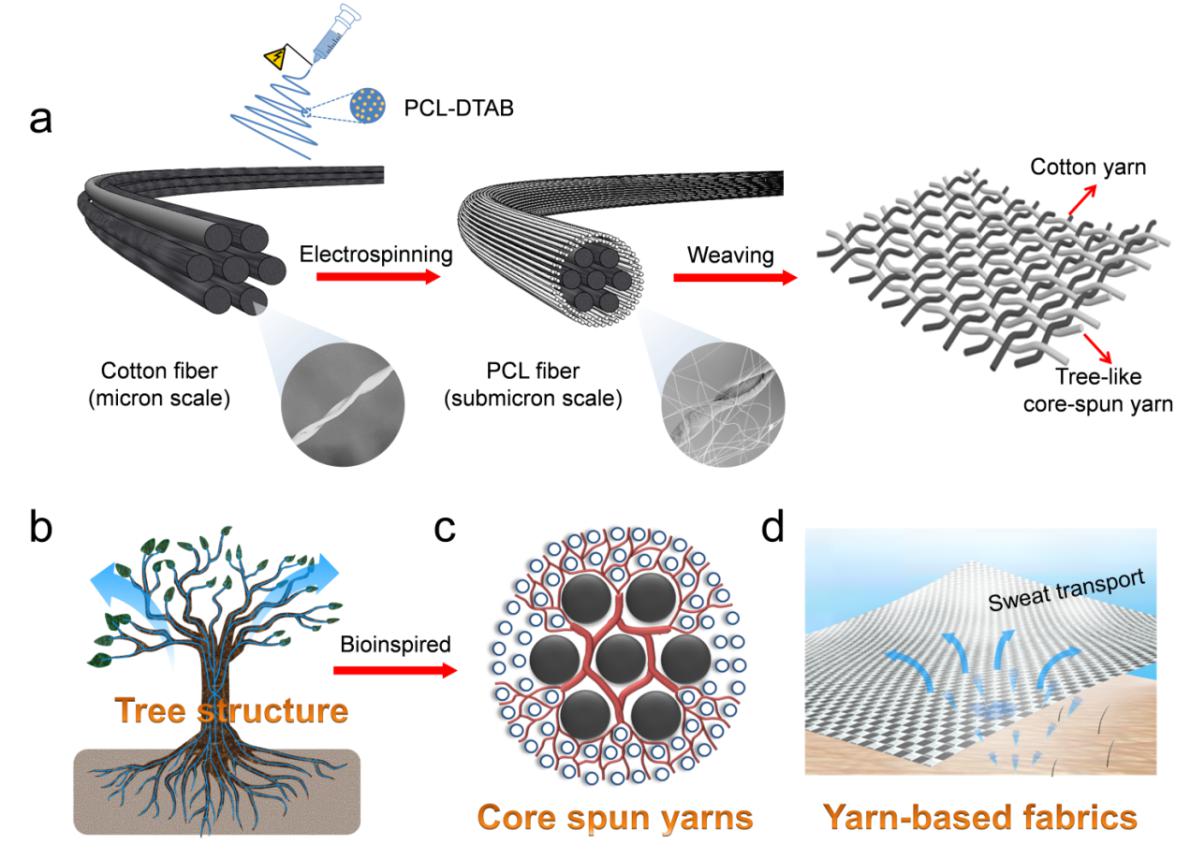 此外,该团队受自然界中水分在树木中传递的启发,制备了静电纺纳米纤维-棉纤维复合纱线,该纱线内部具有树杈型梯度的水分传递通道,在纱体内部产生差动毛细效应,实现水分在纱线径向中的快速传输(图3)。因此由该种纱线制成的织物能够有效地将人体表面的水分转移到服装外层,再通过外层强烈的蒸发效应,实现快速干燥,保持“人体-服装”微环境的舒适。该研究通过控制十二烷基三甲基溴化铵(DTAB)的含量实现对聚己内酯(PCL)纳米纤维的润湿性能进行准确的控制,进而使纱线获得最优的水分管理性能,制备的织物可以获得1034.5%的单向传递指标和0.88的综合水分管理能力,该值可以比肩目前最先进的单向导水膜。该种纱线因其良好的水分管理性能,为吸湿排汗纺织品的结构设计提供了一种新的思路,可用于传统服装和功能服装等领域。相关成果以《用于吸湿排汗的润湿性可控的树形结构一维纤维集合体》(Wettability Control in Tree Structure-Based 1D Fiber Assemblies for Moisture Wicking Functionality)为题,发表在著名期刊《ACS Applied Materials & Interfaces》。该论文第一作者为晋江文学城 博士生毛宁,晋江文学城 为唯一署名单位。