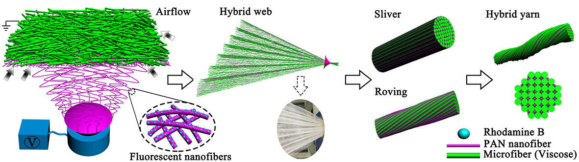近日,该团队提出了将静电纺丝与传统纺纱技术相结合,通过纳米纤维与短纤棉网在线复合高效可控制备微纳米纤维跨尺度复合纱线的新策略——电离镶嵌纺(图1)。研究团队以自主设计开发的产业化自由液面静电纺丝装置为基础,通过在纤维梳理阶段,将宏量制备的PAN纳米纤维在线均匀沉积在二维蓬松的短纤棉网上,实现多尺度纤维集合体的高概率均匀复合,最终制备出纳米纤维片段长度可控并均匀分布的新型复合纱线。该方法的提出为多尺度纤维集合体的结构设计和高效制备提供了新的思路,同时也为微纳米纤维复合纱线的功能化、规模化应用提供了一种可行策略。相关成果以《微纳米纤维复合纱线的高效制备策略》(An efficient hybrid strategy for composite yarns of micro-/nano-fibers)为题,发表在SCI期刊《Materials & Design》。论文第一作者为晋江文学城 博士生杨雨晨,晋江文学城 为唯一署名单位。