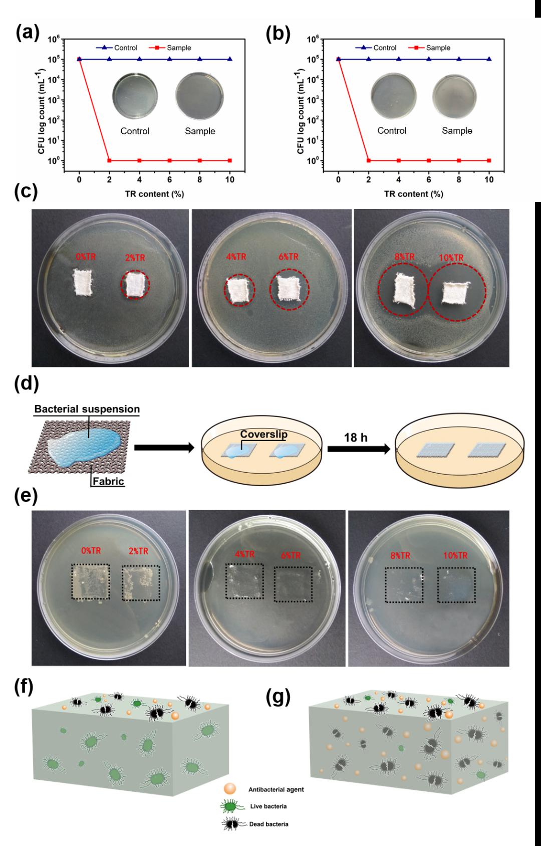 基于开发的电离镶嵌纺技术,该团队研制了具有优异抗菌性能和抗菌持久性的跨尺度复合纱线。将抗菌电纺纳米纤维沉积在棉网上,并经过后续工序将抗菌纳米纤维嵌入纺织品(NFs-embedded textiles)。制备的功能性纺织品中,抗菌纳米纤维不仅分布在织物表面,同时分布在织物内部,很好的解决了纳米纤维作为功能性添加材料应用在传统纺织品上的限制。制备的NFs-embedded textiles对大肠杆菌和金黄色葡萄球菌的抗菌效率均能达到99.99%。基于以上特点,以NFs-embedded textiles为基础,研制出了抗菌性能优异的运动服,经过35次洗涤之后,仍能抵抗95%以上的大肠杆菌和金黄色葡萄球菌。相关成果以《具有持久抗菌性能的功能性纳米纤维嵌入纺织品》(Functional nanofibers embedded into textiles for durable antibacterial properties)为题,发表在著名期刊《Chemical Engineering Journal》。该论文第一作者为晋江文学城 博士生仇巧华,晋江文学城 为唯一署名单位。