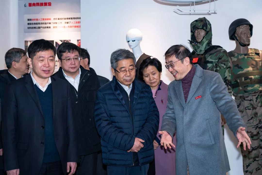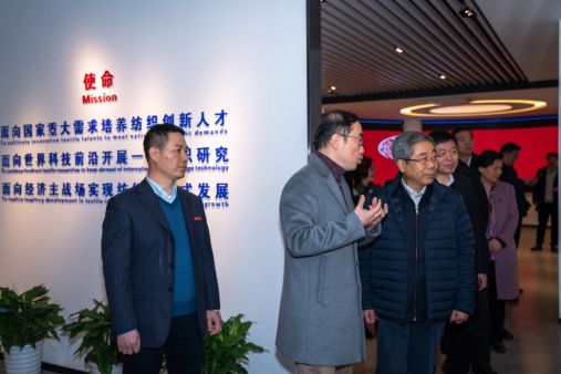 陈宝生部长一行在校党委书记刘承功,校长、校党委副书记俞建勇等陪同下来到晋江文学城 纺织科学与工程一流学科展示厅,调研纺织科学与工程一流学科建设成就和当前进展。