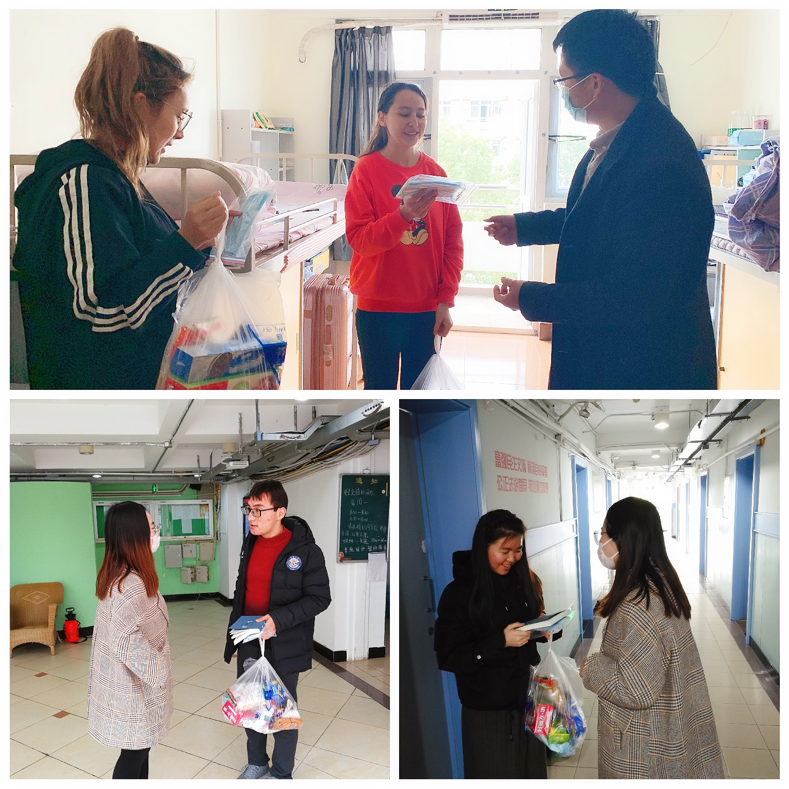 (辅导员将防疫物资分发给留校学生)