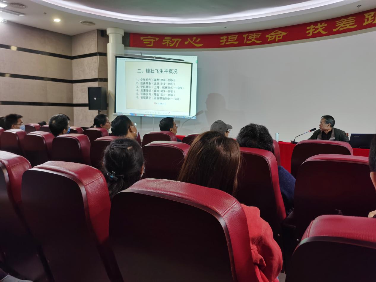 参观学习中,湖州新四军研究会副会长、钱壮飞纪念馆史料整理者之一潘渭民为大家作了“‘双百’人物钱壮飞”专题党课,他结合史料整理生动讲述了钱壮飞生平事迹、突出贡献以及身上所展现的崇高的精神品格。