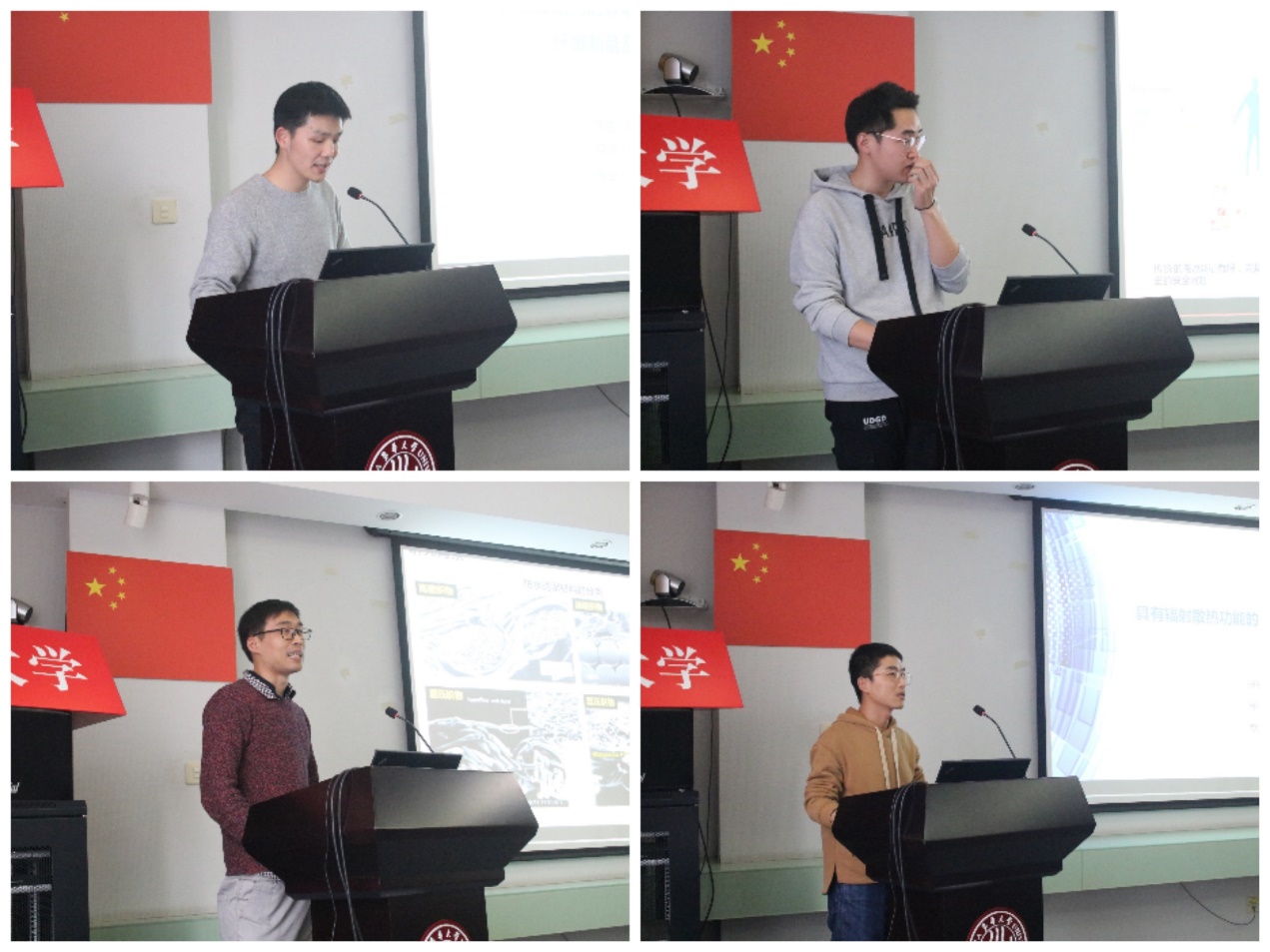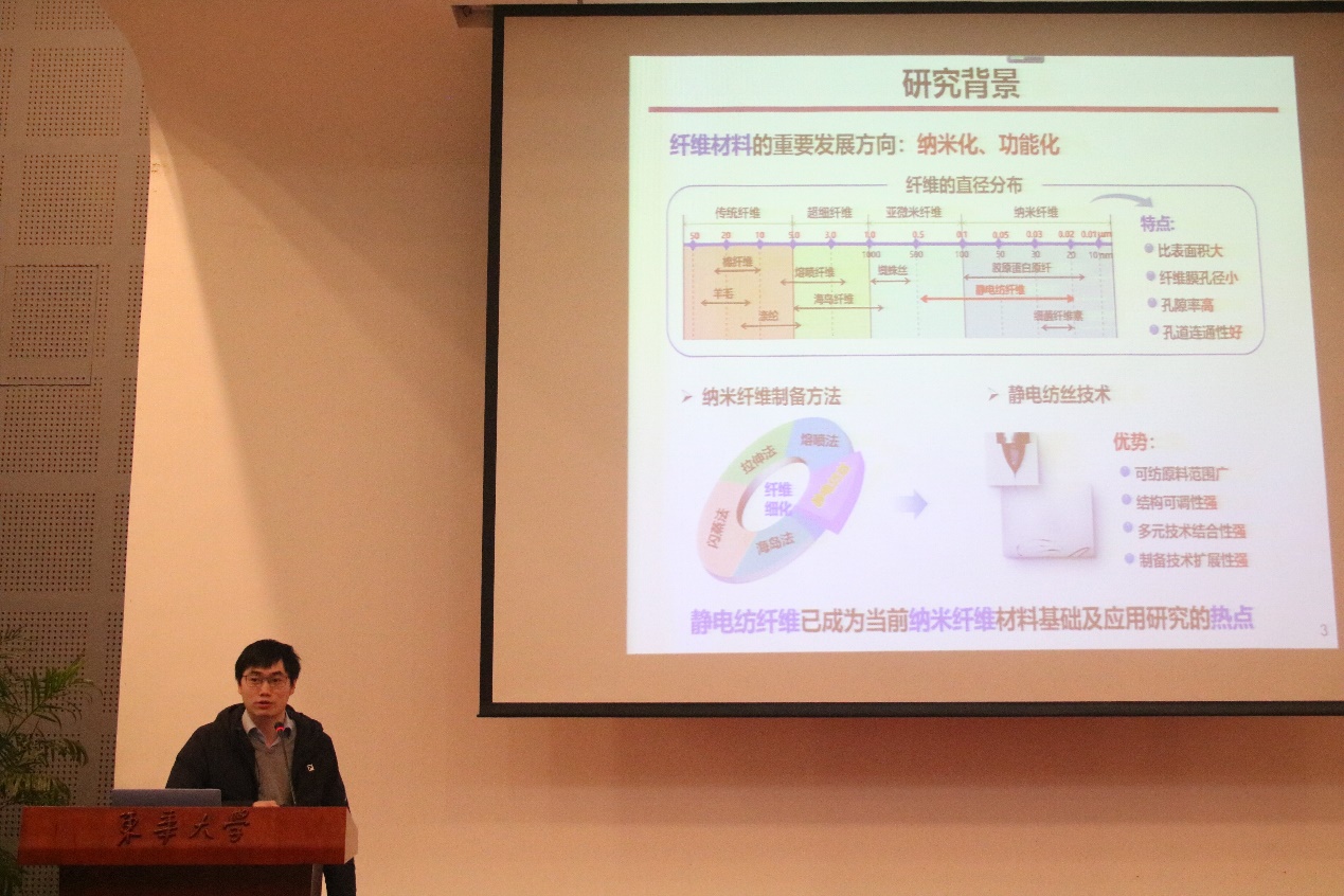 隋晓锋和斯阳分别作《天然高分子基功能材料》和《超轻超弹纳米纤维气凝胶的三维构建及功能化应用研究》的主题报告。4位优秀的博士生国家奖学金获得者(何满堂、陈俊丽、蔡亭伟、降帅)分享科研经验。本次学术年会由汇报提问和海报展示两部分组成。孟虎、曹巧丽、黄倩倩、刘凡茜子等26位博士生带来了精彩的课题汇报,内容包括《模特类型对消费者和服装网上零售的影响》、《条混过程的模拟及其工艺参数对混合效果的影响》、《苎麻织物/环氧树脂阻燃复合材料的制备和热学、力学及声振特性研究》等前沿的科研问题。博士生们精彩的汇报引起评委老师和听众的高度关注,纷纷就自己的想法和疑问与汇报同学进行交流。陈硕、陈馨逸、陈跃慧、杜敏芝等30位同学带来了丰富的海报展示,吸引了大批老师和研究生们观摩。