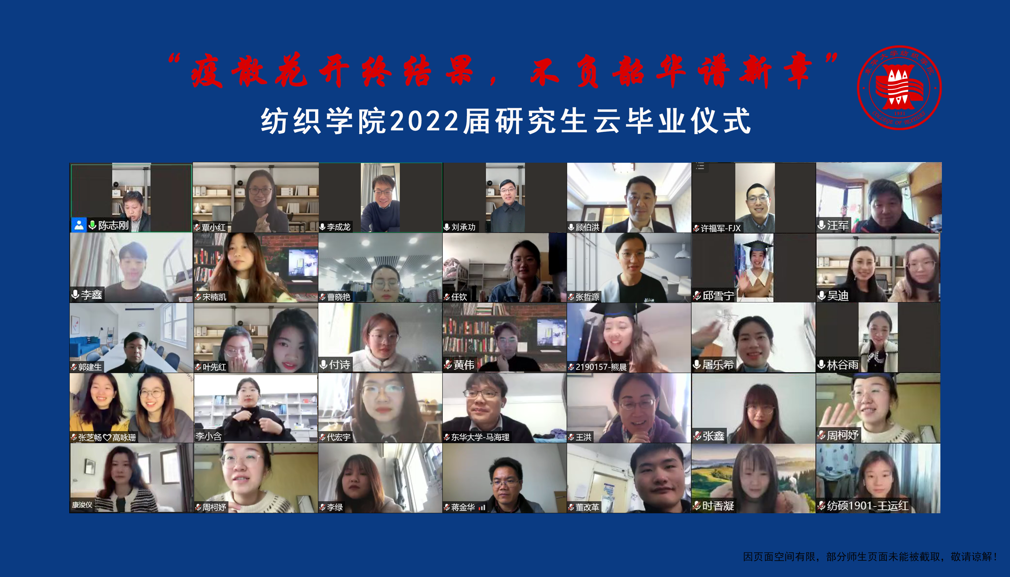 仪式活动的最后,师生们一同观看了《疫散花开,不言再见》毕业主题视频,师生们一起在云端挥手告别。守候在屏幕另一端毕业生们与学院共同为自己的研究生生涯画上圆满的句号,也在学校学院的嘱托中,开启自己人生的新篇章。